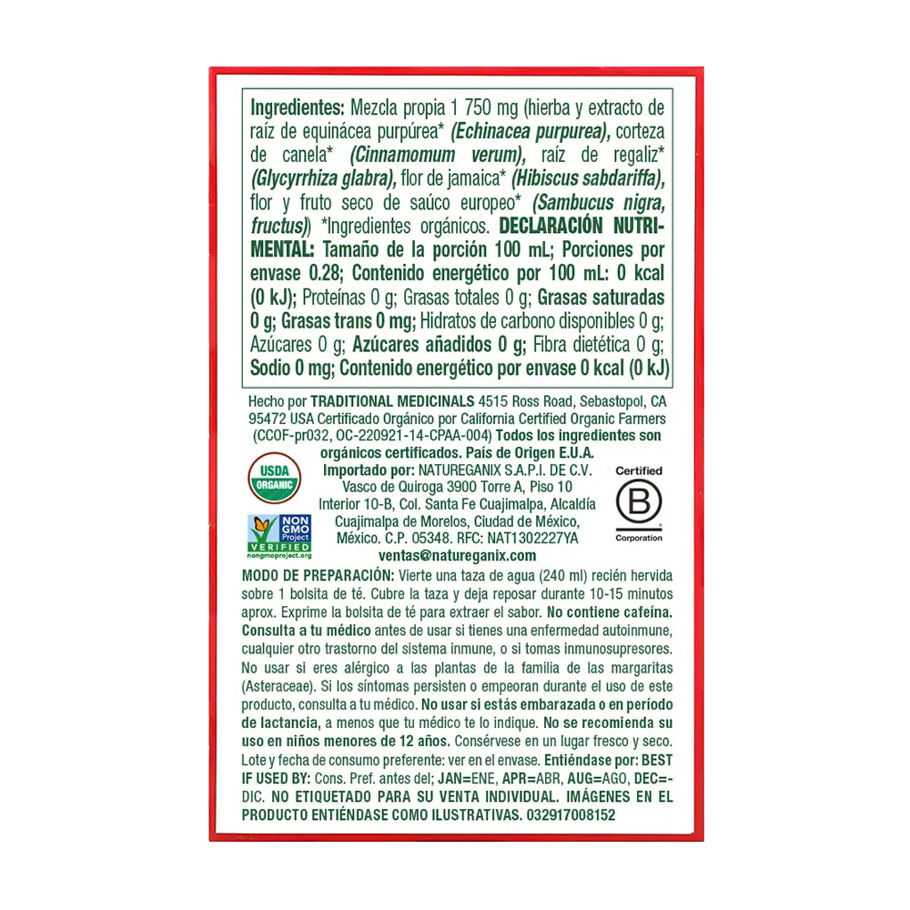 (Glycyrrhiza glabra), flor de jamaica* (Hibiscus sabdariffa), flor y fruto seco de saúco europeo* (Sambucus nigra, fructus) *Ingredientes orgánicos.