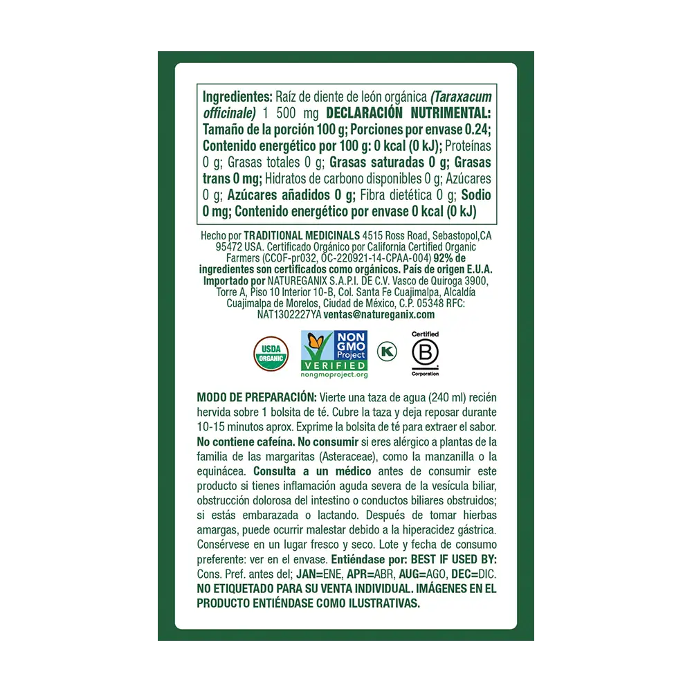 Raíz tostada de diente de león orgánico (Taraxacum officinale) 1 500 mg.