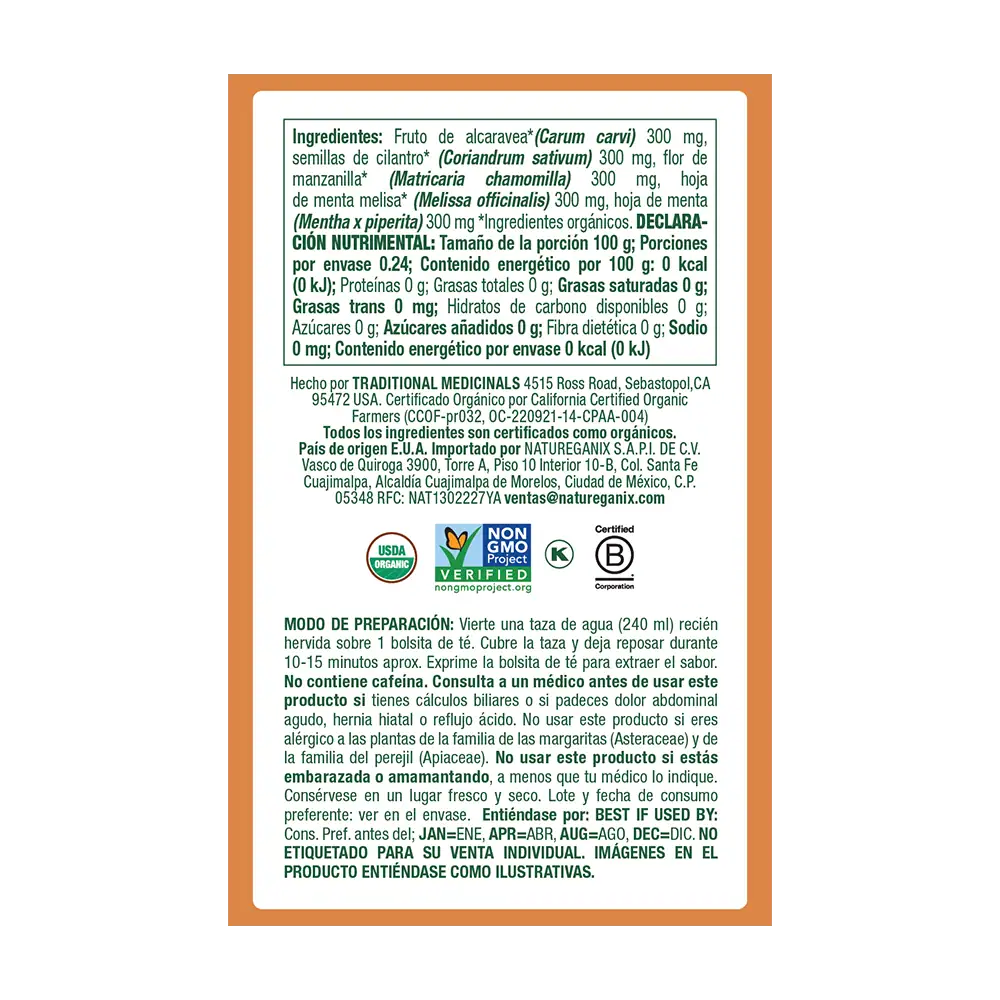 Fruto de alcaravea* (Carum carvi) 300 mg, semillas de cilantro (Coriandrum sativum) 300 mg, flor de manzanilla* (Matricaria chamomilla) 300 mg, hoja de menta melisa* (Melissa officinalis) 300 mg, hoja de menta (Mentha x piperita) 300 mg *Ingredientes orgánicos.