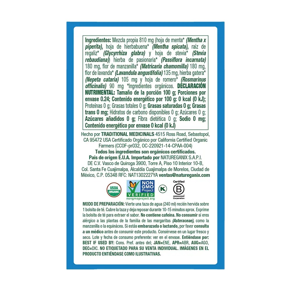 Mezcla propia 810 mg (hoja de menta* (Mentha x piperita), hoja de hierbabuena* (Mentha spicata), raíz de regaliz* (Glycyrrhiza glabra) y hoja de stevia* (Stevia rebaudiana)) hierba de pasiflora* (Passiflora incarnata) 180 mg, flor de manzanilla* (Matricaria chamomilla) 180 mg, flor de lavanda* (Lavandula angustifolia) 135 mg, hierba gatera* (Nepeta cataria) 105 mg y hoja de romero* (Salvia rosmarinus) 90 mg *Ingredientes orgánicos.