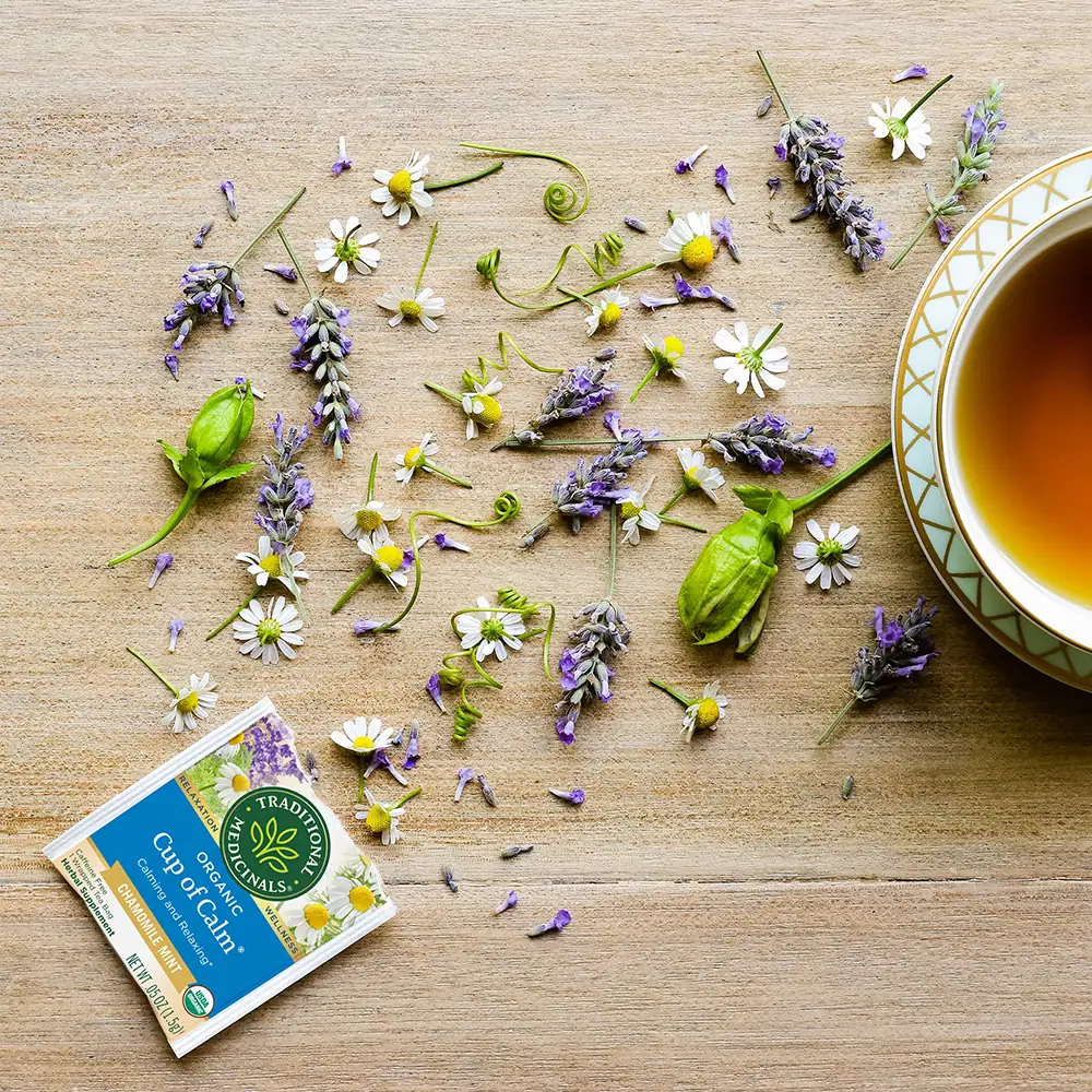 Cup of Calm® es una infusión elaborada con una mezcla única de hierbas orgánicas reconocidas por su tradición en la herbolaria ancestral. La pasiflora, la manzanilla y la lavanda se combinan en una taza diseñada para crear un espacio de serenidad en tu día. Ideal para quienes buscan un respiro natural frente al ritmo acelerado, cada sorbo conecta con el poder de las plantas para invitar a la calma.