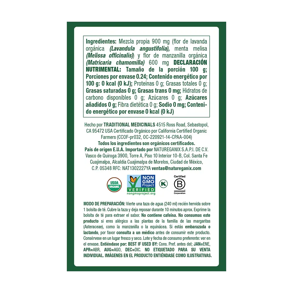 Mezcla propia 900 mg (flor de lavanda orgánica (Lavandula angustifolia), menta melisa (Melissa officinalis)) y flor de manzanilla orgánica (Matricaria chamomilla) 600 mg.