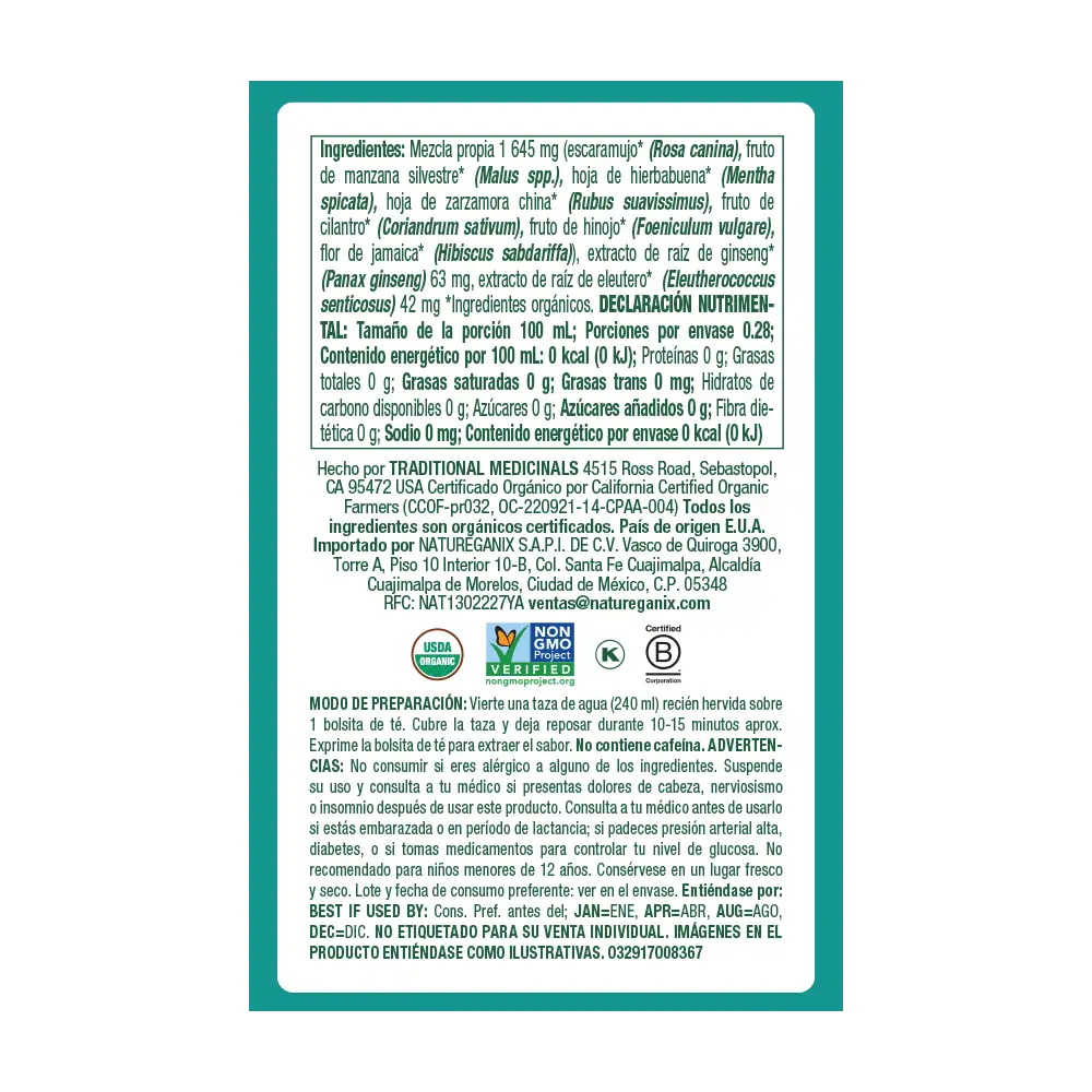 Mezcla propia 1 645 mg (escaramujo* (Rosa canina), fruto de manzana silvestre* (Malus spp.), hoja de hierbabuena* (Mentha spicata), hoja de zarzamora china* (Rubus suavissimus), fruto de cilantro* (Coriandrum sativum), fruto de hinojo* (Foeniculum vulgare), flor de jamaica* (Hibiscus sabdariffa), extracto de raíz de ginseng* (Panax ginseng) 63 mg, extracto de raíz de eleutero* (Eleutherococcus senticosus) 42 mg *Ingredientes orgánicos.