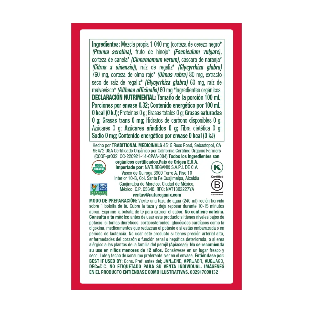 Mezcla propia 1 040 mg (corteza de cerezo negro* (Prunus serotina), fruto de hinojo* (Foeniculum vulgare), corteza de canela* (Cinnamomum verum), cascara de naranja* (Citrus x sinensis)), raiz de regaliz* (Glycyrrhiza glabra) 760 mg, corteza de olmo rojo* (Ulmus rubra) 80 mg, extracto seco de raíz de regaliz* (Glycyrrhiza glabra) 60 mg, raíz de malvavisco* (Althaea officinalis) 60 mg *Ingredientes orgánicos.